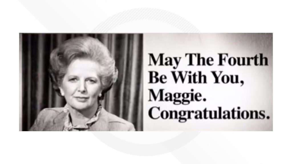 May The Fourth Be With You first emerged in mainstream pop culture on May 4, 1979. The UK’s Conservative Party celebrated the landslide election of the first female Prime Minister of the western world, that indomitable Iron Lady, Mrs Margaret Thatcher herself, by taking out a half-page ad in the London Evening News, which read…