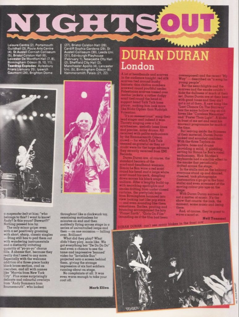 Duran Duran are, of course, the standard bearers of the scarf-and-headband-wearers. Simon Le Bon wore a red scarf round his head and a large white scarf round his neck, dangling down across his black stage uniform. After a lengthy build-up with searching spotlights and smoke drifting from under closed curtains, the pretty(ish) boys from Birmingham bounced into view looking just like pop stars — and even sounding like them sometimes. Smiles, pouting and bouncing accompanied the hits ‘Planet Earth’, ‘Girls On Film’ (sounding as if the film had been overexposed) and the recent ‘My Way’* — described as “a song for young people”.