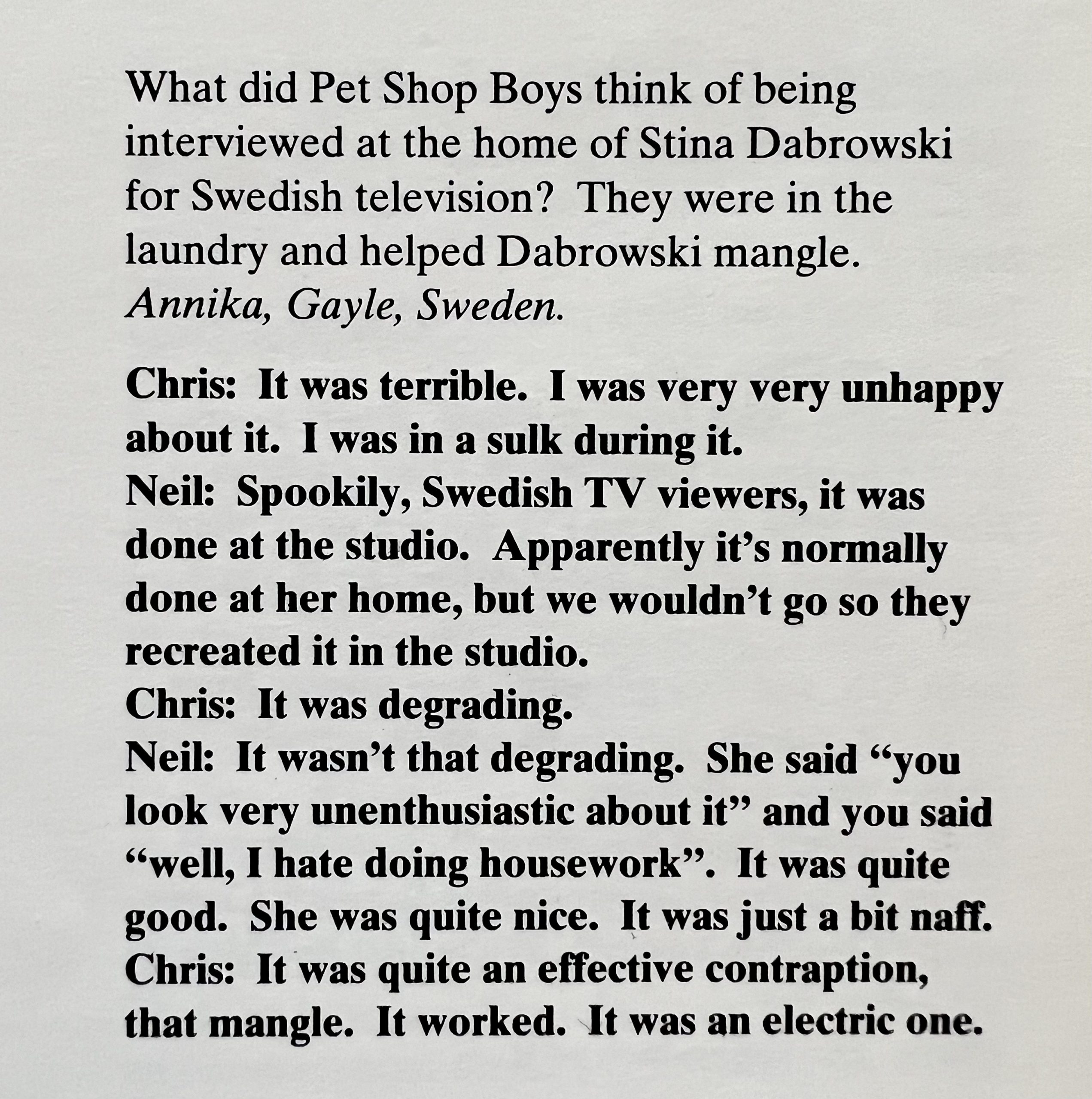 For reasons best known to herself, when Stina interviewed the seminal pop duo on her Dabrowski programme in the days following the demise of Thatch’s fascist groove thang, she requested that Neil Tennant and Chris Lowe answer questions while she does the laundry. Though with their trademark negative energy coupled with that infamous “we wouldn’t normally do this kind of thing” reticence, Ver Boys refused to go to her home.