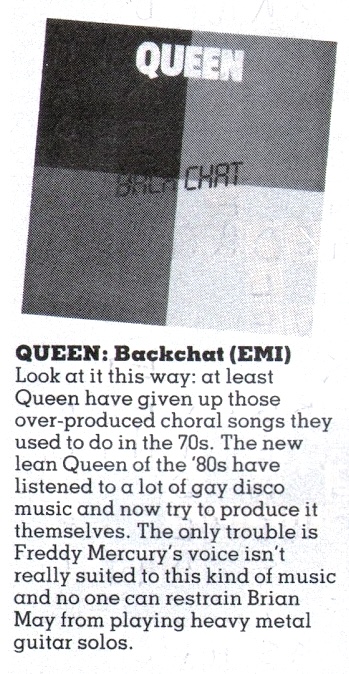 *Back Chat is an English idiom referring to impertinent or impudent replies, especially to a superior, though it’s debatable if Neil Tennant would have ever considered Queen his superiors. Here‘s his August 1982 review that was alluded to in the header. Funny, the future PSB man spells Freddie’s name wrong, dishes on Brian yet makes no mention that the dance song’s author is not the unwieldy guitarist but the often brilliant bassist Deacy. It’s a funny life.